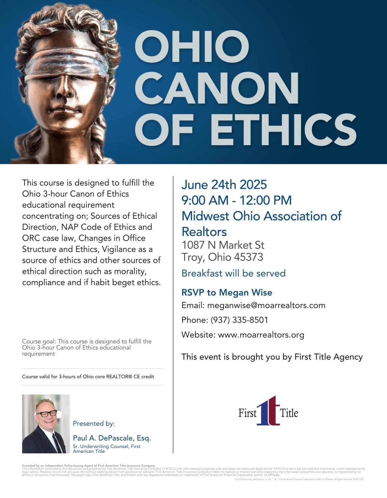 CLASS DESCRIPTION: This course is designed to fulfill the Ohio 3-hour Canon of Ethics educational requirement concentrating on; Sources of Ethical Direction, NAR Code of Ethics and ORC case law, Changes in Office Structure and Ethics, Vigilance as a source of ethics and other sources of ethical direction such as morality, compliance and if habit beget ethics.